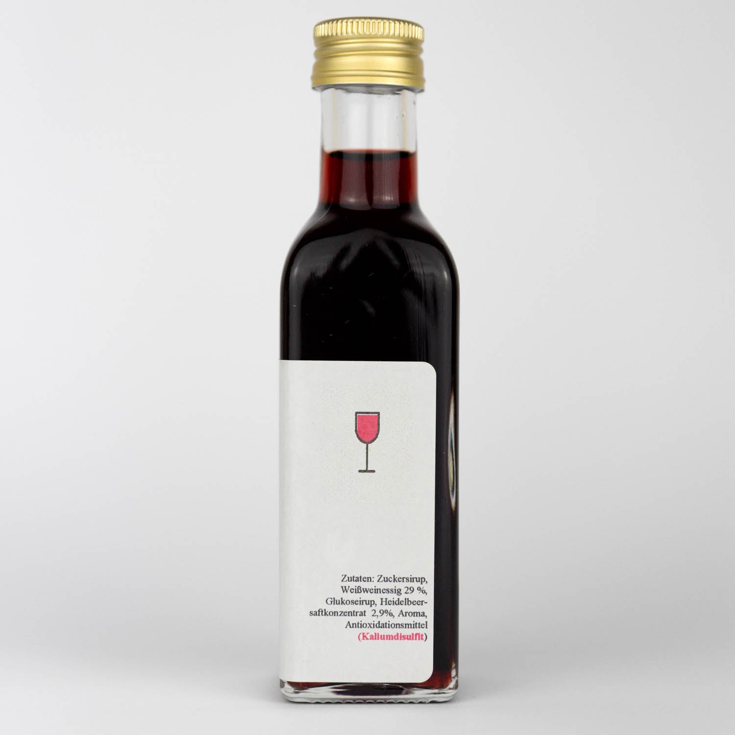 Hergestellt aus: Zuckersirup, Weißweinessig (29 %), Glukosesirup, Heidelbeersaftkonzentrat (2,9 %), Aroma, Antioxidationsmittel: KALIUMDISULFIT