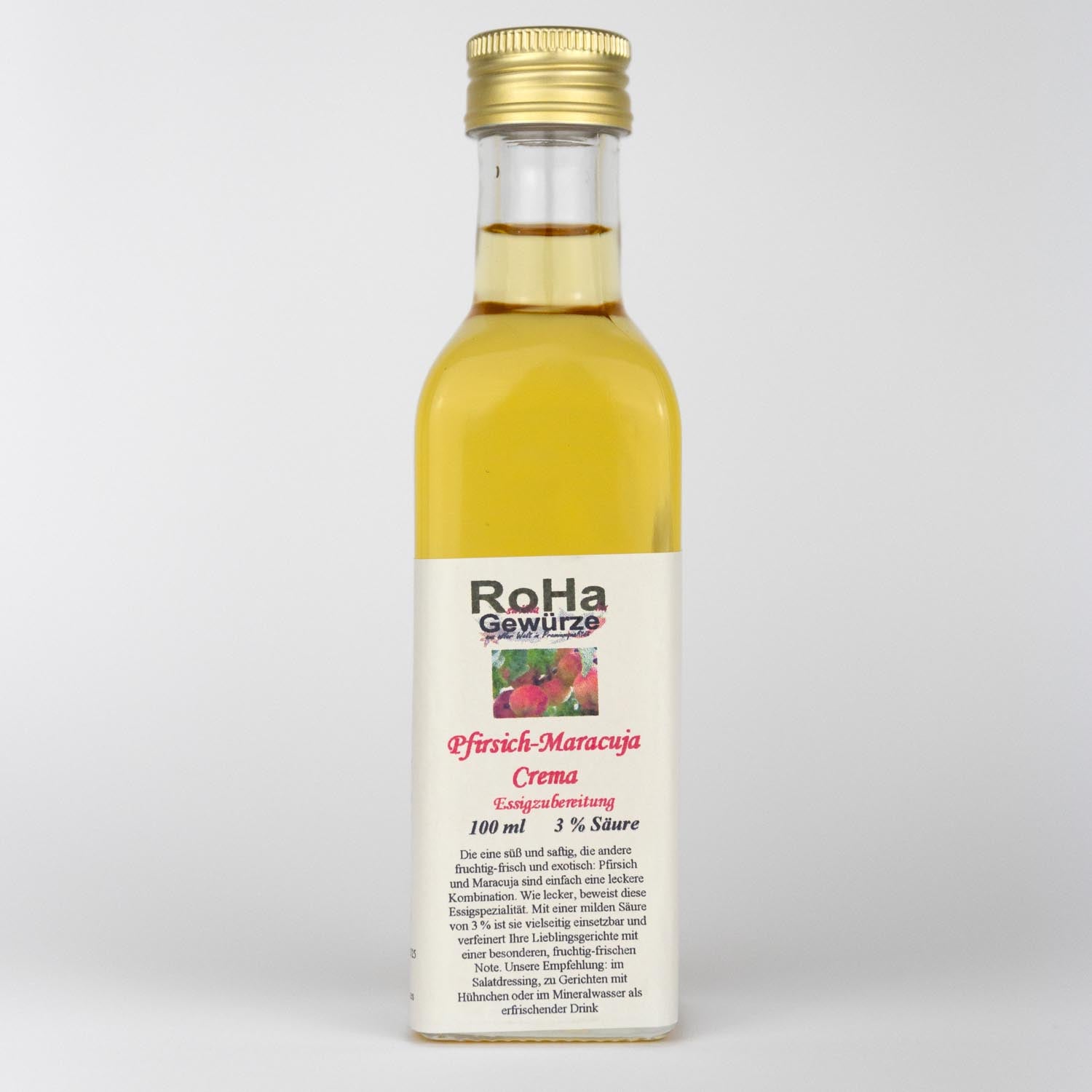 Lassen Sie sich von unserer Pfirsich-Maracuja Crema verzaubern! Diese Essigspezialität vereint die Süße saftiger Pfirsiche mit der exotischen Frische der Maracuja zu einem einzigartigen Geschmackserlebnis. Mit ihrer milden Säure ist sie vielseitig einsetzbar und verfeinert Ihre Lieblingsgerichte mit einer besonderen fruchtig-frischen Note.